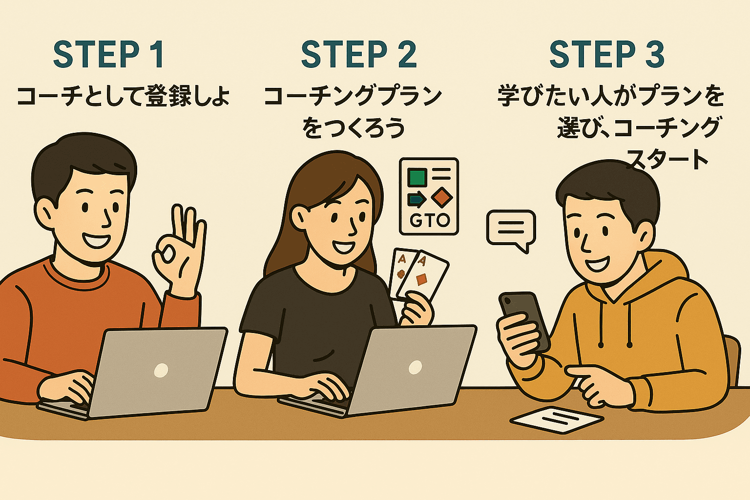 ポーカーを教えられる人は、コーチとして無料登録!得意なスタイルや指導内容をプロフィールに書いて、自分だけのページを作成。